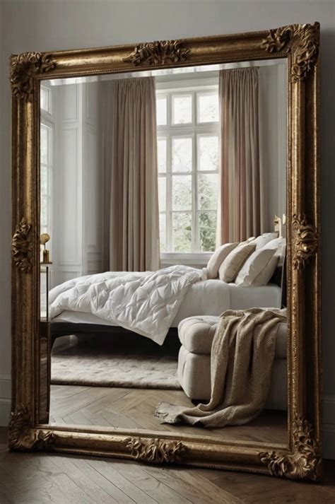 A large, oversized mirror not only adds a touch of glamour to your bedroom but also creates the illusion of a more spacious and明亮空间。将其放置在床头板上方的墙上,形成一个引人注目的焦点,同时反射光线,营造出通风、宜人的氛围。